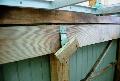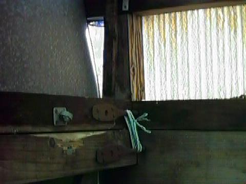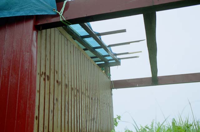 南東側の屋根の状況。(1999/06/23追加) 波板はなくなりタル木も激しく損傷している。 ただ、冷静に考えてみると、ひさしはこんなに長くなかったような気もする。 屋根はあまりに自然な状態になっているので深く考えていなかったが、 阿部さんのメイルにあったように一度分解してから再度ここに組み上げてくれたのだとしたら、 かなりバラバラの状態から組んでいるはずで、 大変な手間がかかっている事は容易に想像される。 |