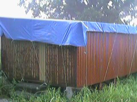 全体像(西方向より) この方向から見ると大した被害はなさそうだが、 南東側の屋根の波板は下の画像のように激しく損傷している。 |