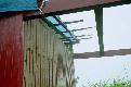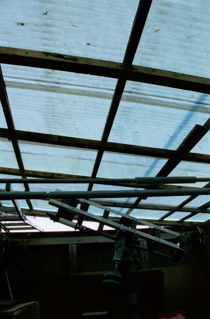 屋根を内側から見た状況。(1999/06/23追加) このあたりは波板もほとんど傷んでいないが、 ところどころにある釘の穴や、妙に食い違っているタル木の状態からみて、 やはり一度分解してから再度組み上げてくれたのではないかと強く思わせる。 |