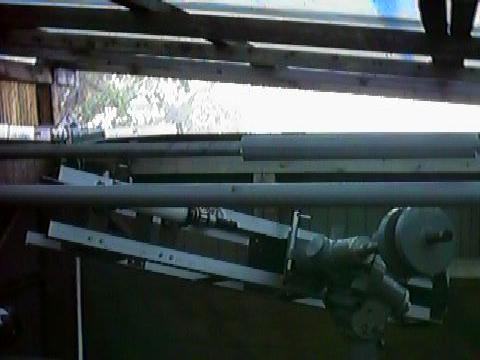 観測棟の中(南東側面)から外が見える... ^^; この望遠鏡は鏡筒を外して宿泊棟に移し、架台も北西側の土台に移動した。 また、これの足元に置かれていた 8cm屈折は宿泊棟に、発電機は北西側の土台に移した。 |